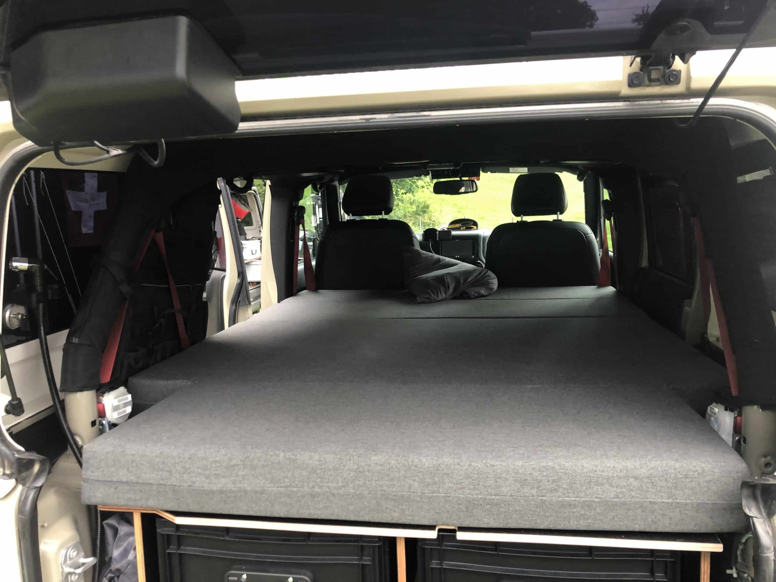 Auch ohne unsere Klappmatratze war der Jeep schon ein Schmuckstück, doch durch die maßgeschneiderte EvoPore Matratze wird er zum perfekt durchdachten Abenteuermobil.