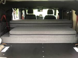 Durch die speziell angeordneten Klappelemente kommt man weiterhin an alle Staufächer und auch der Kühlschrank lässt sich bequem öffnen. Die Matratze besteht aus unseren EVO-Pore Schaum und wurde mit dem robusten Automobilbezug gefertigt.