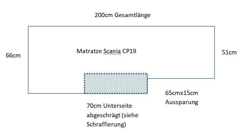 Passgenaue LKW-Matratze für den Scania CP19. Bitte vergleichen sie die benötigte Größe mit unseren Infos auf der Skizze/den Bildern. Auf der Unterseite der Matratze befindet sich eine Nut für die Kunsstoffkante der Matratzen-Auflagefläche.