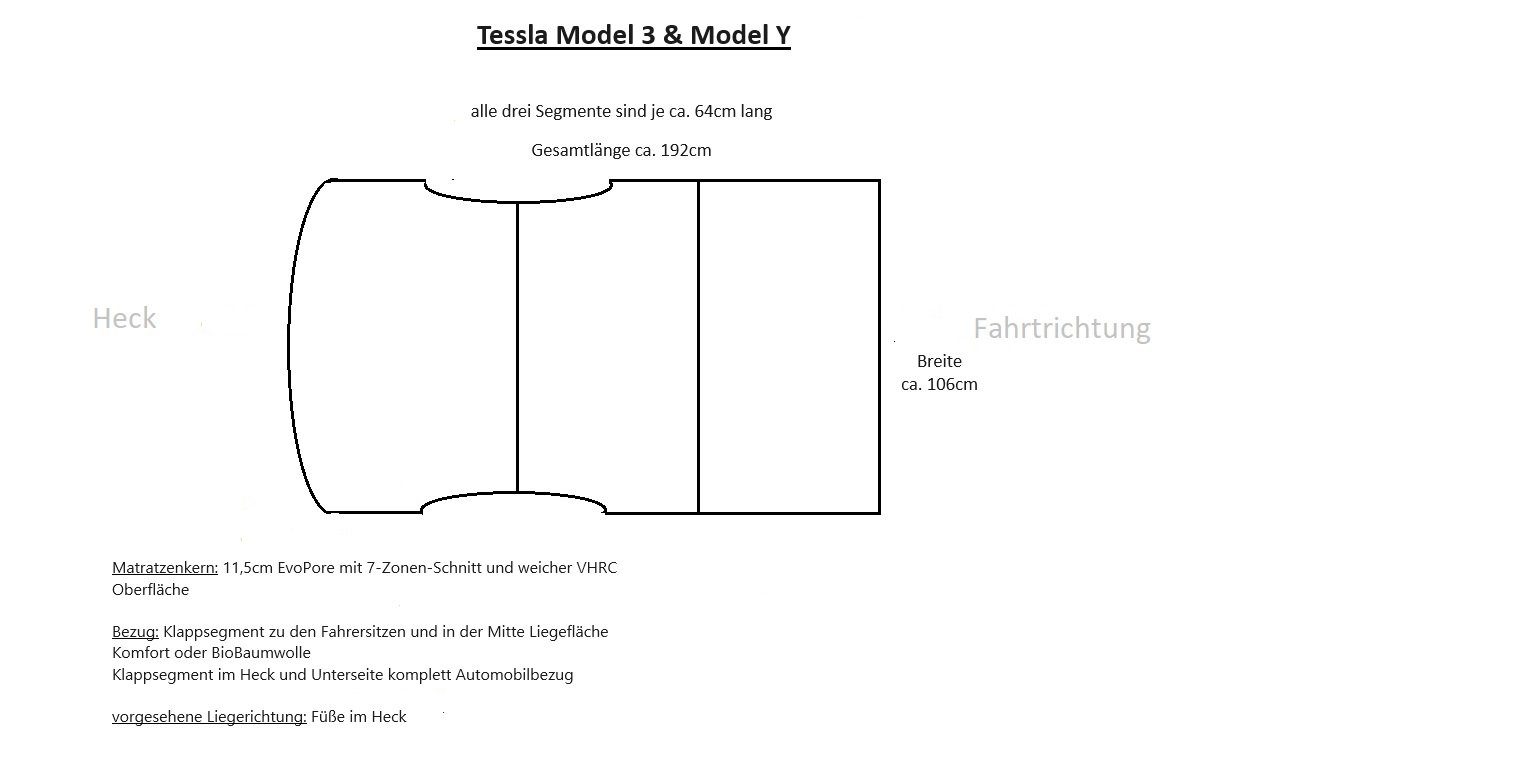 Die Optima Klappmatratze bietet außergewöhnlich hohen Liegekomfort. Sie besteht aus EvoPore HRC Komfort Material. Die Matratze ist dabei 11,5cm dick und ist mit einem 7-Zonen Schnitt ausgestattet. Die Matratze für den Tesla Model Y ist ca.192cm lang und ca.106cm breit. Im Bereich der Heckklappe verjüngt sich die Matratze passgenau. Durch die spezielle Konstruktion der Matratze kann diese sehr einfach zusammengeklappt werden. Aufgrund der geringen Höhe im Heck des Tesla, ist die Schlafrichtung zu den Vordersitzen hin vorgesehen. Durch die Komfort-Höhe von ca. 11,5cm und der extrem offenporigen VHRC-Oberfläche ist diese Matratze wesentlich komfortabler als viele Produkte von Mitbewerbern.
