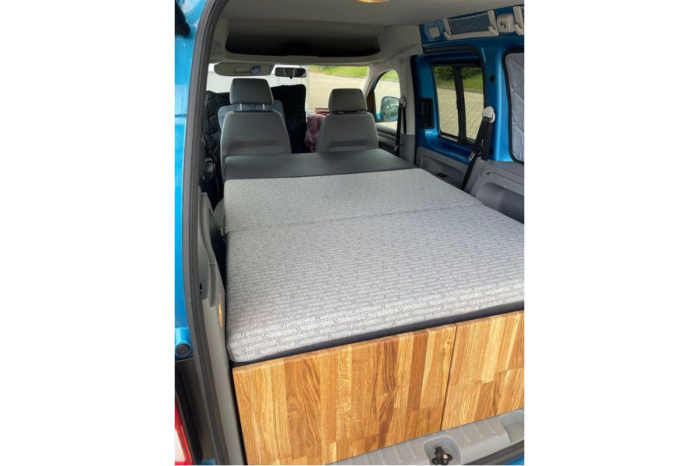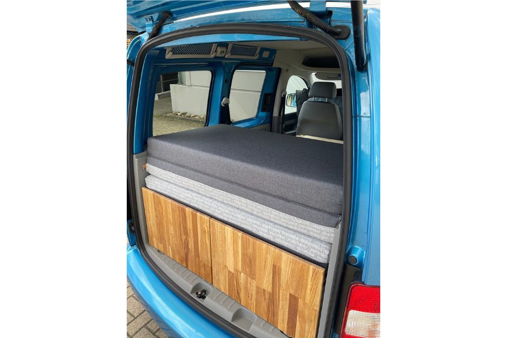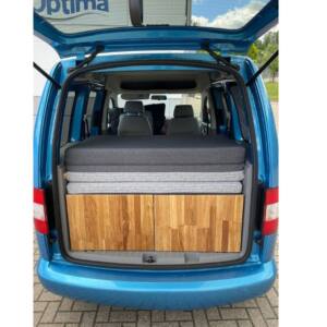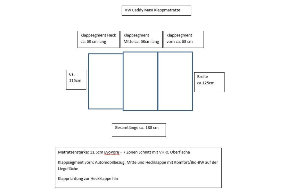 Die Optima Klappmatratze bietet außergewöhnlich hohen Liegekomfort. Sie besteht aus EvoPore HRC Komfort Material. Die Matratze ist dabei 11,5cm dick und ist mit einem 7-Zonen Schnitt ausgestattet. Die Matratze für den VW Caddy Maxi (langer Radstand) ist ca. 190cm lang und ca.125cm breit. Im Bereich der Heckklappe verjüngt sich die Matratze auf ca. 115cm. Durch die Komfort-Höhe von ca. 11,5cm und der extrem offenporigen VHRC-Oberfläche ist diese Matratze wesentlich komfortabler als viele Produkte von Mitbewerbern.