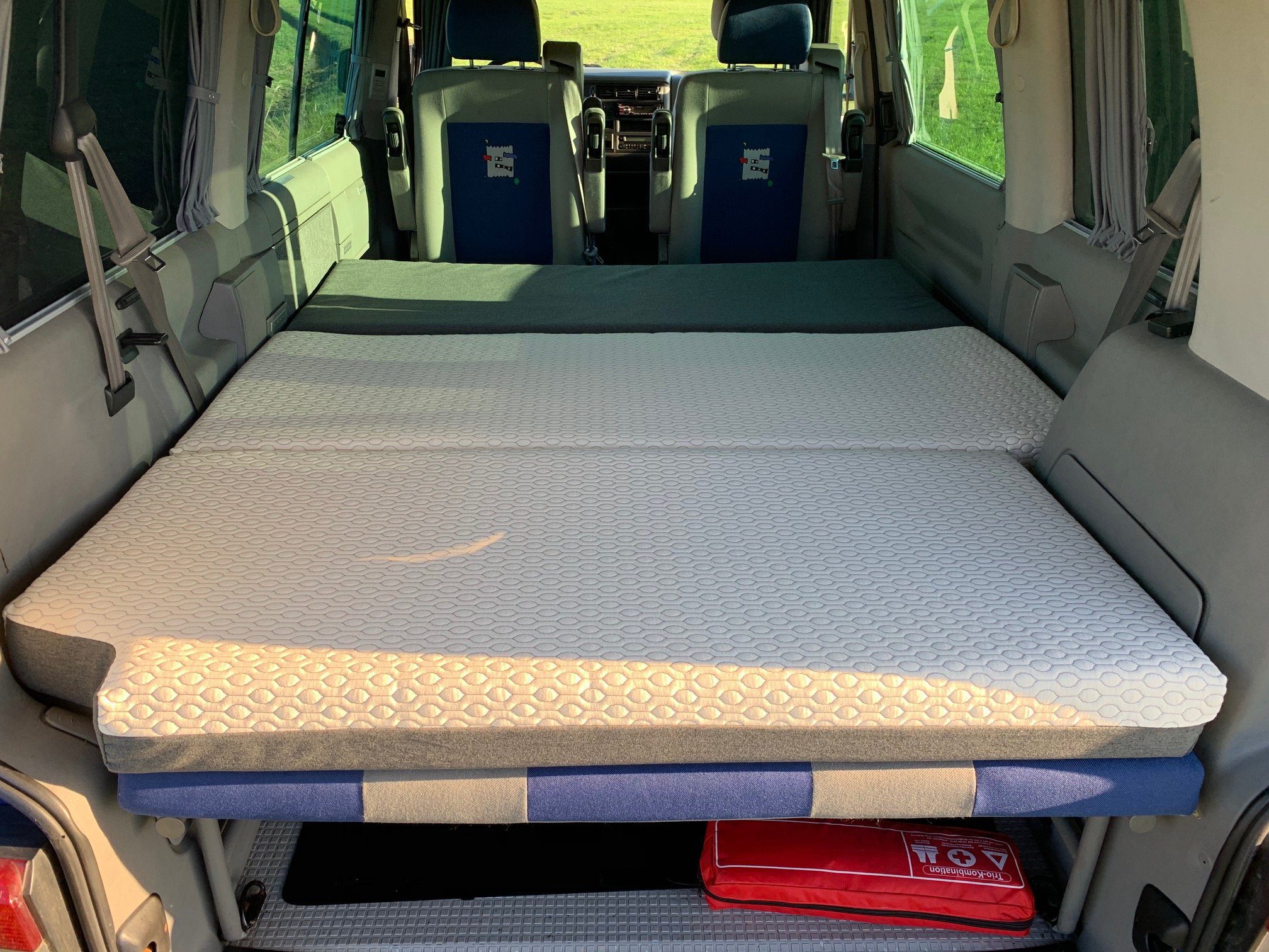 Die Optima Klappmatratze für den VW T4 bietet außergewöhnlich hohen Liegekomfort. Sie besteht aus EvoPore HRC Komfort Material. Die Matratze ist dabei 11,5cm dick und ist mit einem 7-Zonen Schnitt ausgestattet. Die Matratze für den VW Multivan T4 ist ca. 186cm lang und ca.152cm breit. Im Bereich der Heckklappe verjüngt sich die Matratze passgenau. Durch die spezielle Konstruktion der Matratze kann diese sehr einfach zusammengeklappt werden. Durch die Komfort-Höhe von ca. 11,5cm und der extrem offenporigen VHRC-Oberfläche ist diese Matratze wesentlich komfortabler als viele Produkte von Mitbewerbern.