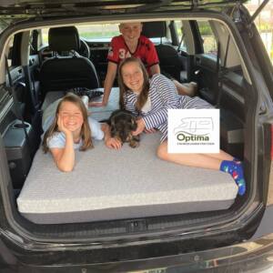 Die Optima Klappmatratze bietet außergewöhnlich hohen Liegekomfort. Sie besteht aus EvoPore HRC Komfort Material. Die Matratze ist dabei 13,5cm dick und ist mit einem 7-Zonen Schnitt ausgestattet. Die Matratze für den Touran II ist ca. 180 cm lang und ca. 112 cm breit (siehe Skizze). Im Bereich der Heckklappe verjüngt sich die Matratze passgenau. Durch die spezielle Konstruktion der Matratze kann diese sehr einfach zusammengeklappt werden. Und im Kofferraum hinter den Rücksitzen verstaut werden. Die Schlafrichtung ist zu den Vordersitzen hin vorgesehen. Durch die Komfort-Höhe von ca. 13,5cm und der extrem offenporigen VHRC-Oberfläche ist diese Matratze wesentlich komfortabler als viele Produkte von Mitbewerbern.